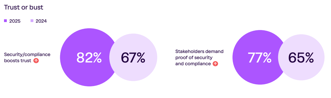 That theme remains strong in the 2025 report, with 82% of those surveyed stating they believe security and compliance enhance customer trust, a significant increase from last year. Moreover, more organizations are experiencing customers and stakeholders seeking evidence of security and compliance.
