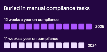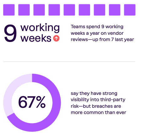 Much like GRC, we also see teams spending an absurd amount of time on manual vendor reviews, at 9 working weeks a year, an increase from the year prior.