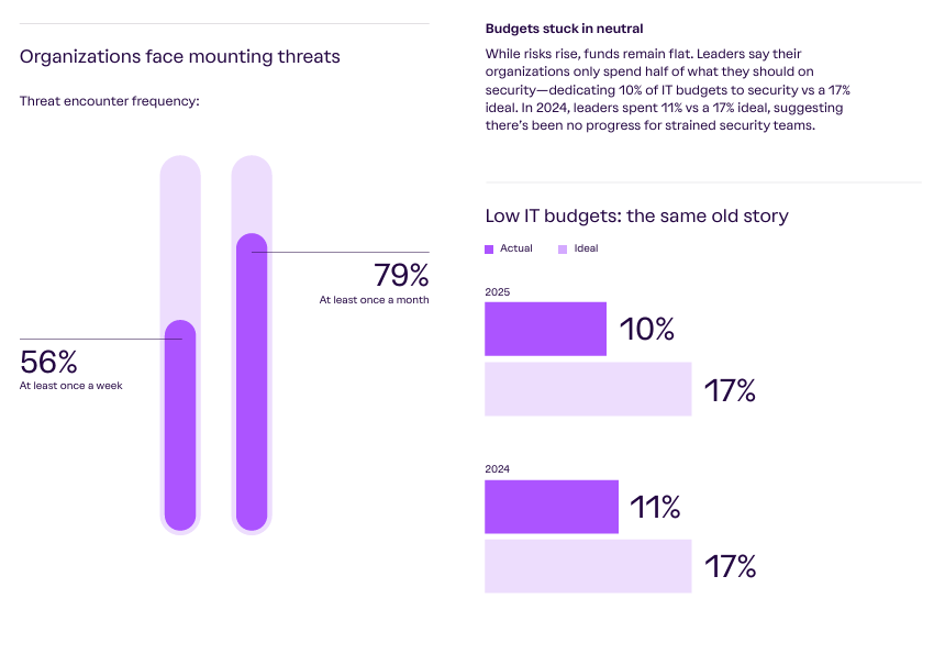 More than half of organizations are encountering threats once a week, and nearly all are experiencing a threat once a month, with 3 in 4 or 72% stating the risks have never been higher for their organizations, all while budgets are actually declining YoY, and security struggles to communicate ROI and cost efficiency.