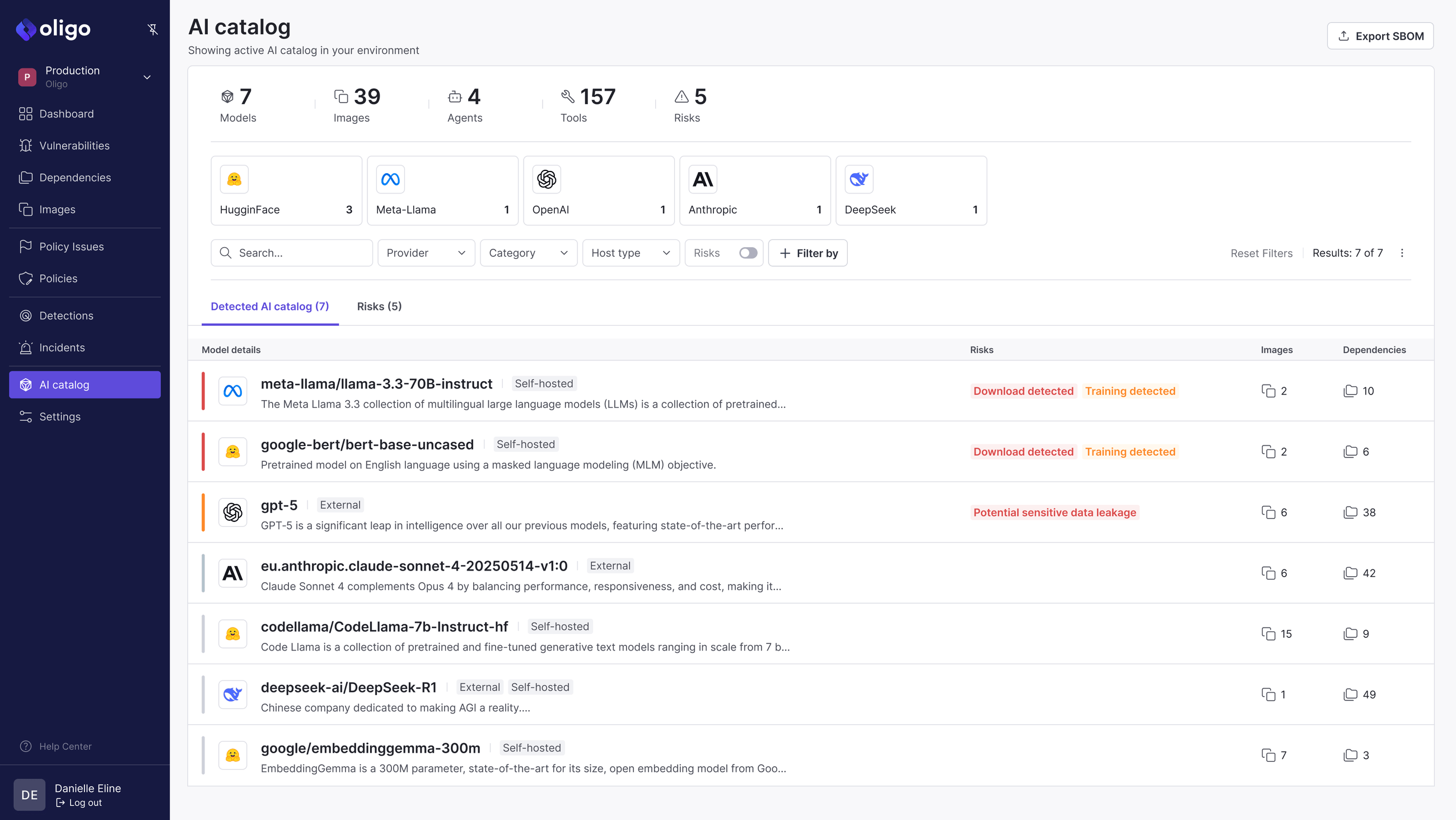 A comprehensive AI catalog, showing models, SDKs, agents and their associated security risks, as well as a real-time AI-BOM, a concept that has been championed by leading organizations such as OWASP in their AI-BOM project.