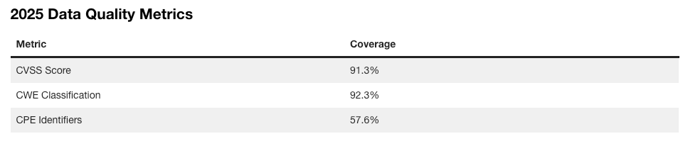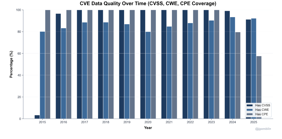 Furthermore, while scanning for CVEs is a tried and trusted practice, the reality is that the CVE ecosystem is problematic, from challenges with the NVD still having a massive backlog of unenriched CVEs due to a funding scare, as well as CVE data quality challenges. In Vulnerability Research Jerry Gamblin’s 2025 CVE report, he highlighted that only 57.6% of CVEs had a CPE identifier. As seen below, the CVE data quality actually dropped in 2025, across not just CPE, but also CVEs having associated CWEs and CVSS as well.