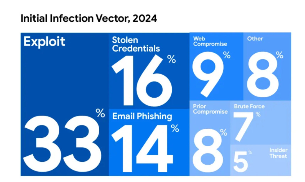 Another major report, Mandiant’s M-Trends showed similar findings, and in fact has vulnerability exploitation being the most dominant initial attack vector, ahead of stolen credentials and email phishing.