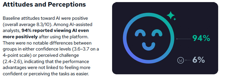 The potentially most significant takeaway when it comes to perceptions of AI in security is the fact that those using the AI SOC agent walked away with 94% of them saying they view AI more positively than they did before the study.