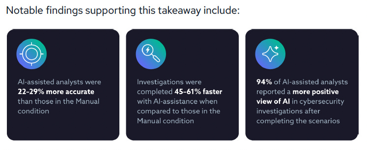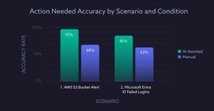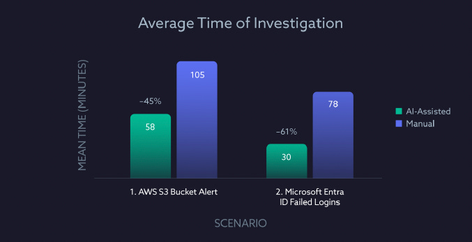 The performance differences were substantial as well, with AI-assisted users investigating the alerts in scenario one at 58 minutes versus 1 hour and 45 minutes, and in 30 minutes compared to 1 hour and 18 minutes in scenario two, compared to those using manual methods. In cybersecurity, where minutes matter and minimizing dwell time is crucial to disrupt data exfiltration, lateral movement, and other threats, these are exponential gains worth noting.