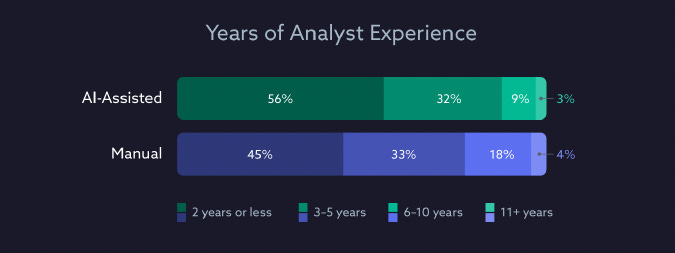 This improved quality is in addition to the enhanced speed and accuracy we discussed above. To build on this insight to highlight the potential impact of alert fatigue, the study also looked at the average response length in words of those using the AI-assisted platform and those investigating the alerts manually, and the group doing it manually saw their investigation step length drop by 27% and their conclusions drop by 20%.