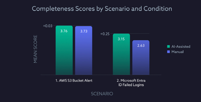 As seen below, those in the manual group scored lower on completeness across both scenarios. As the report itself notes, this problem becomes increasingly exacerbated over time, resulting in numerous alerts, notifications, investigations, and potential incidents, as SOC analysts become fatigued and the quality of their investigations tends to decline. Those in the AI-assisted category were able to maintain their thoroughness over time, demonstrating that investigative quality can be sustained, and these AI tools can mitigate challenges such as fatigue and burnout for those SOC practitioners working without the AI tooling.