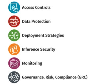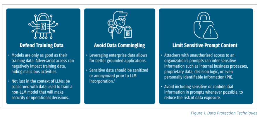 Some of the data protection techniques they cite include defending training data, avoiding data commingling, and limiting sensitive prompt content:
