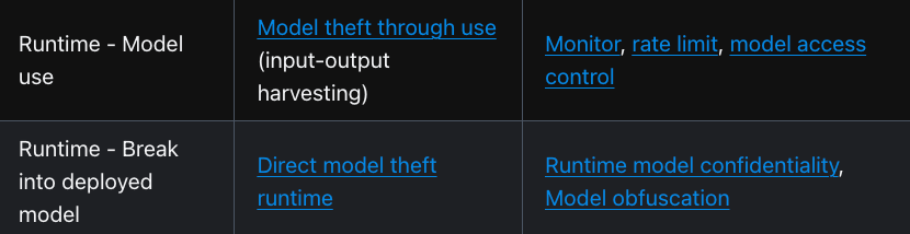 Another key risk is preventing runtime model theft, something another great resource, the OWASP AI Exchange discussions and lists, mitigating controls such as model access control or model obfuscation: