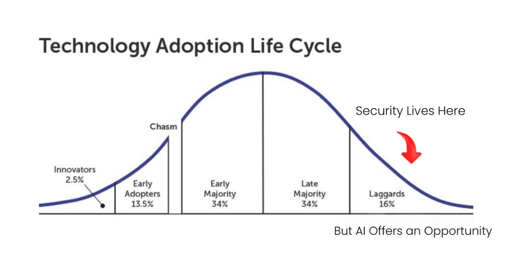 Suppose we want to break the cycle of security being bolted on. In that case, we need to shift from being laggards in cybersecurity to innovators and early adopters of the technology adoption lifecycle.