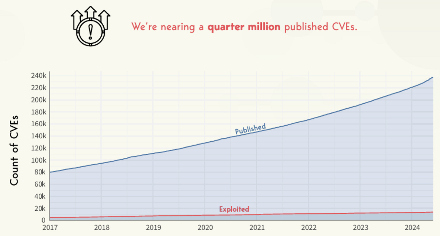 So while CVEs continue to climb, prioritizing based on CVSS base scores alone has teams wasting tremendous amounts of time on findings that never are exploited, as seen below: