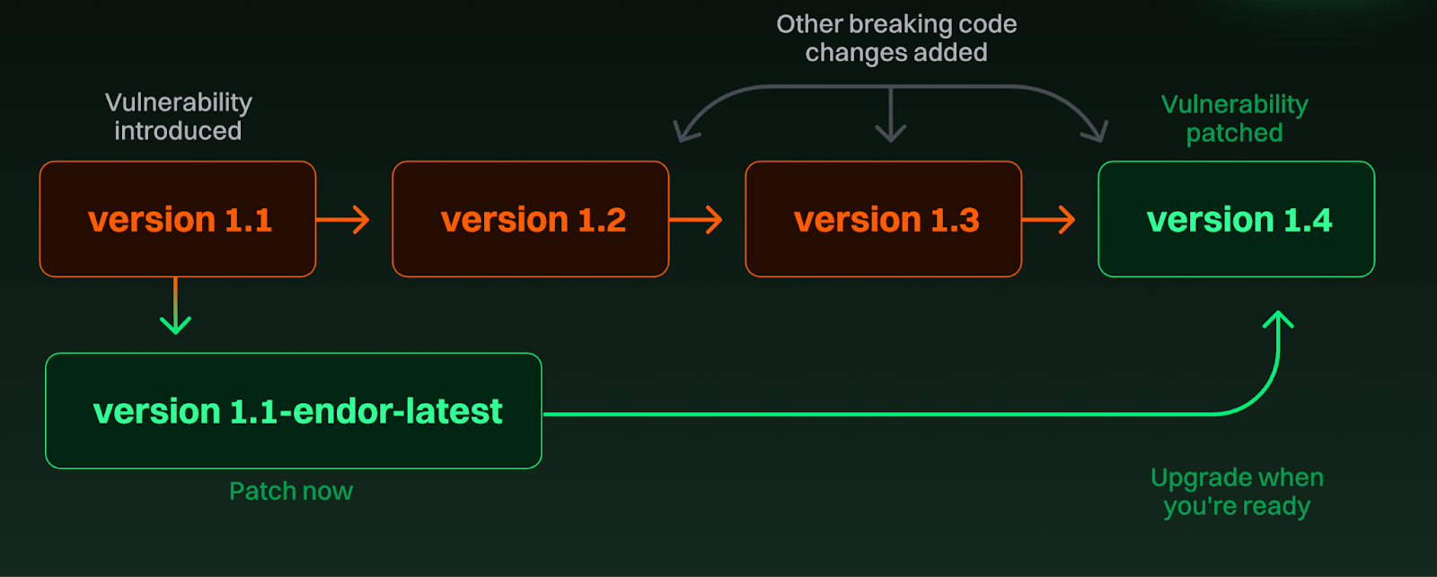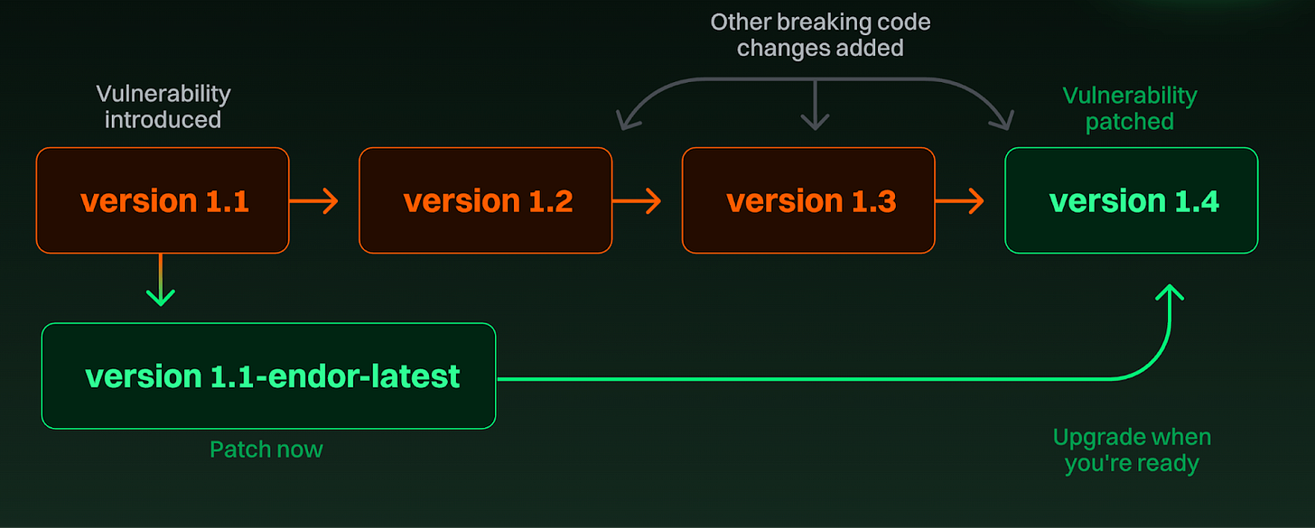 As I discussed in my article “The 2025 Open Source Security Landscape”, 90% of codebases contain components that are more than 10 versions behind the most current version, so this problem is pervasive. It is due to factors such as organizations lacking the remediation capacity, or being reluctant due to the breaking changes I mentioned above. Endor Patches helps tackle this challenge directly.