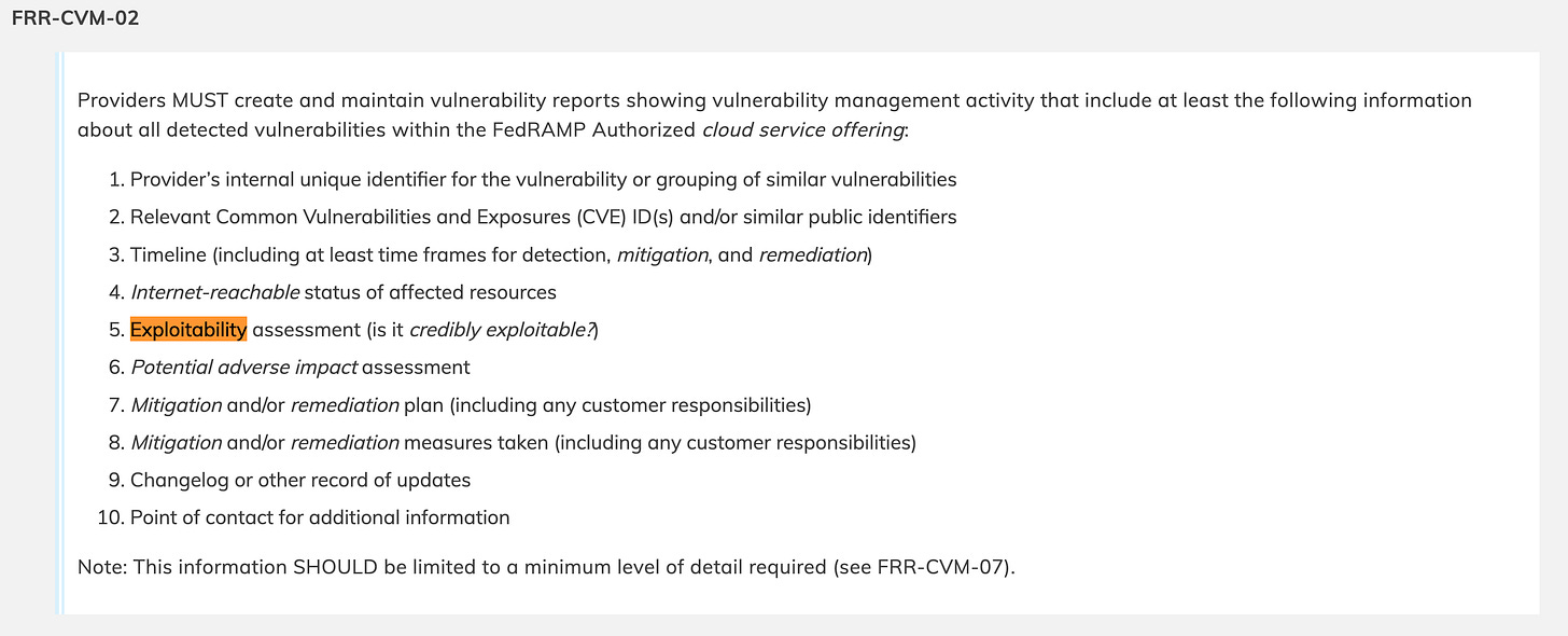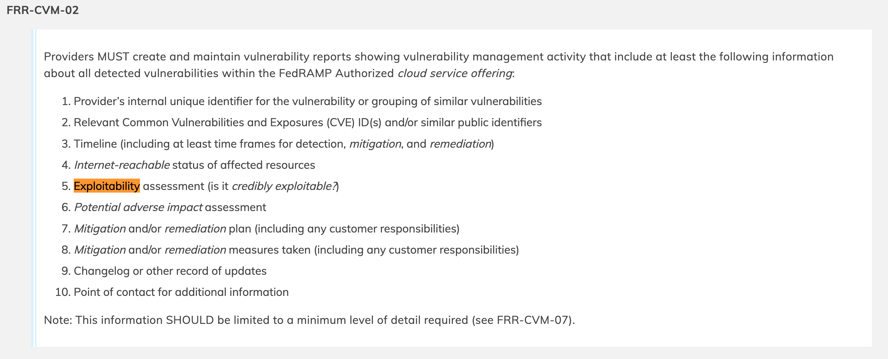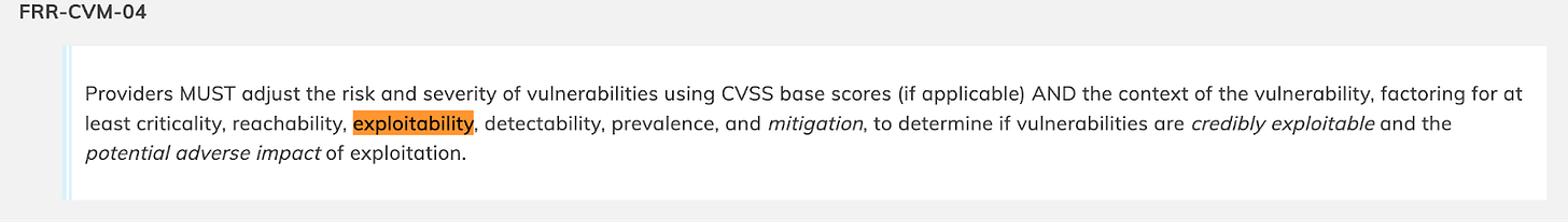 Here you see FedRAMP stressing that providers MUST adjust the risk and severity of vulnerabilities using not just CVSS but also context such as reachability and exploitability. Again, this is a long overdue change because less than 5% of CVEs annually ever see exploitation activity. When you adjust for factors such as reachability, that number drops even further. Accounting for these factors helps development and engineering focus on real risks to the organization, rather than just blindly trying to remediate “all the highs and criticals” when referring to CVSS base scores.