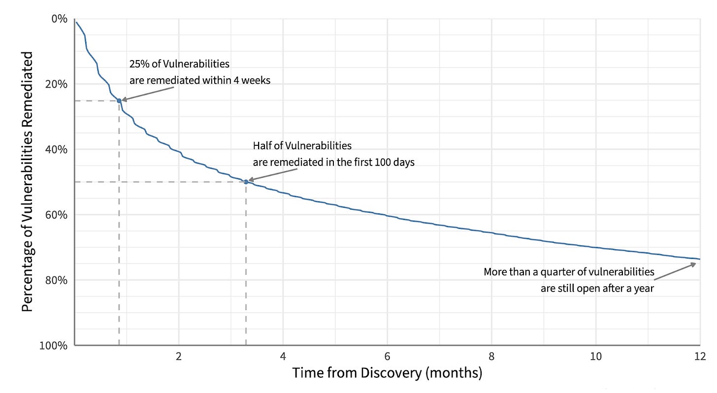 For example, Cyentia Institute found that 25% of vulnerabilities are remediated within the first 4 weeks, while half are remediated within the first 100 days, and nearly 25% of all vulnerabilities remain open after a year.