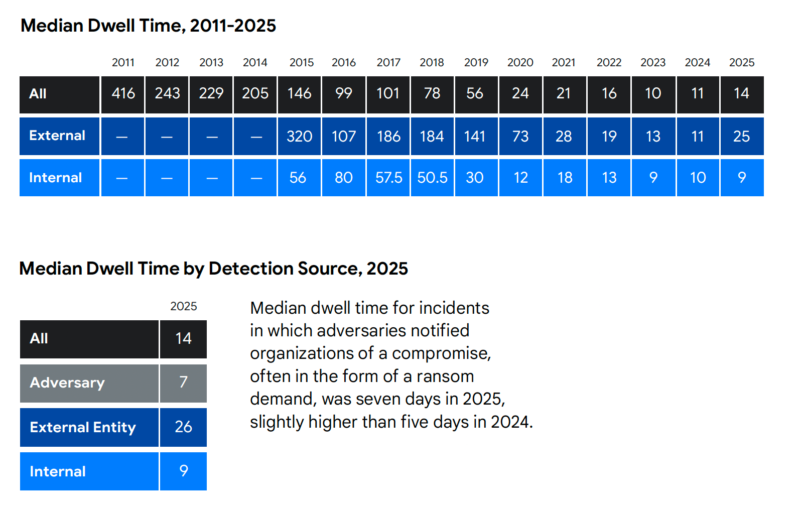 Notably, internal detection dwell time actually improved from 10 to 9 days. The overall increase is driven by external notification cases, where dwell time jumped from 11 to 25 days, pulled up by long-dwell espionage campaigns and threat actors like North Korean IT workers.