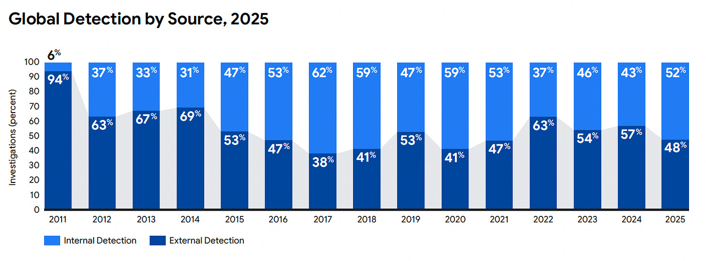 While internal detection improved to 52% in 2025, up from 43% the year prior, that still means 48% of organizations learned about their compromise from someone else. Whether that was law enforcement, CERTs, or even worse, a ransom note from an attacker, which M-Trends notes happens 14% of the time. So 14% of the time the attacker is functioning at your source of letting you know you’ve got an incident, not your team, or your expensive and complex security tech stack.