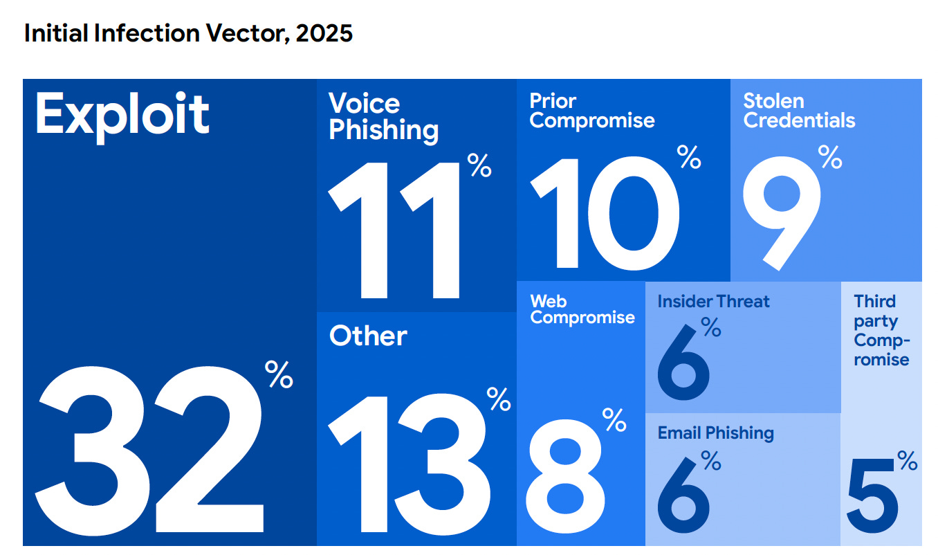 This is not a blip, this is the new normal and it’s happening year-after-year. The 2024 Verizon DBIR showed exploitation tripling with a 180% increase. The 2025 DBIR followed up with another 34% year-over-year rise. Now M-Trends 2026 confirms the same pattern from a completely independent data set. When several of the most respected reports in the industry, built on different data sources and methodologies, all converge on the same conclusion, it is time to stop debating and start acting.