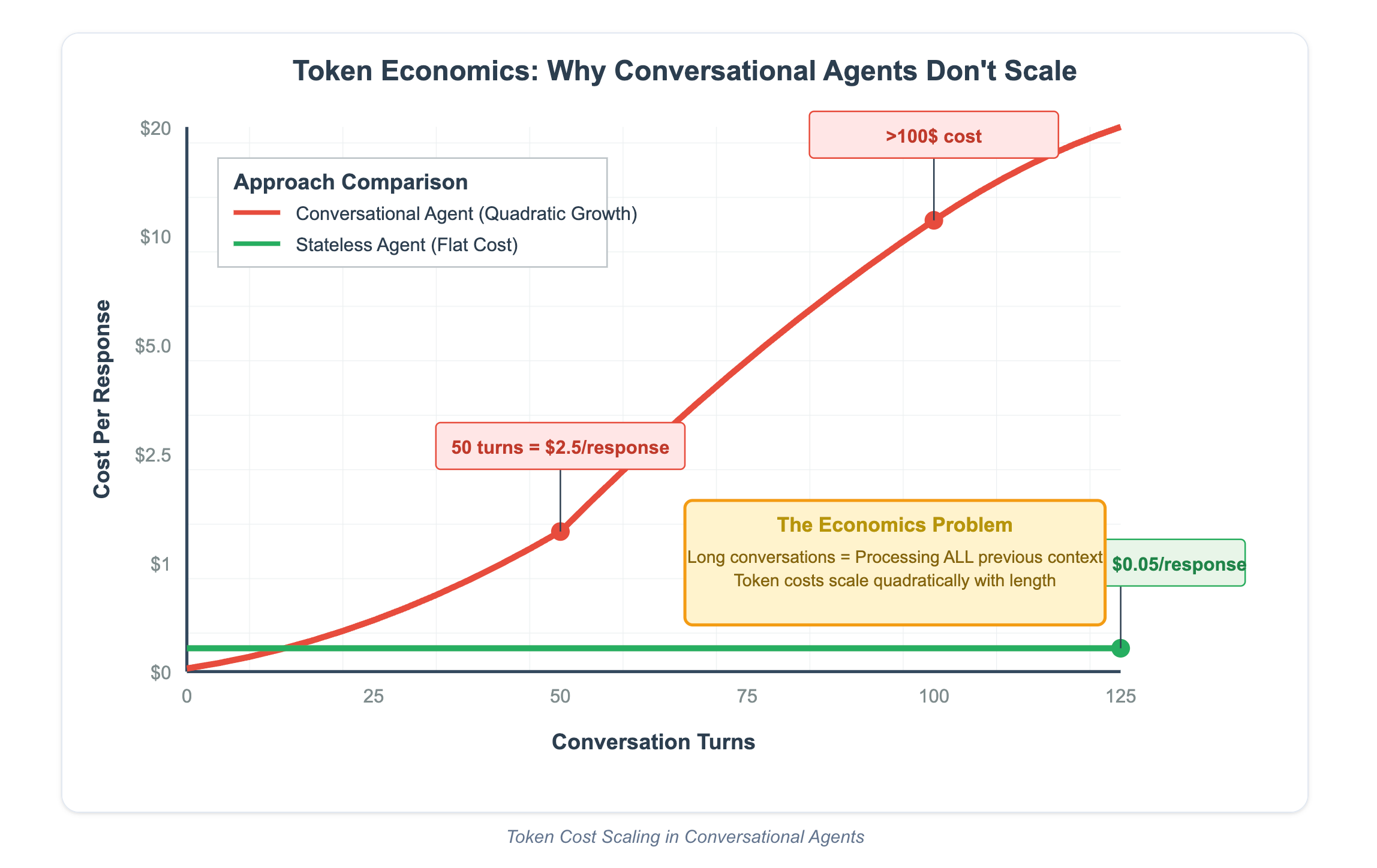 Context windows create quadratic token costs. Long conversations become prohibitively expensive at scale.