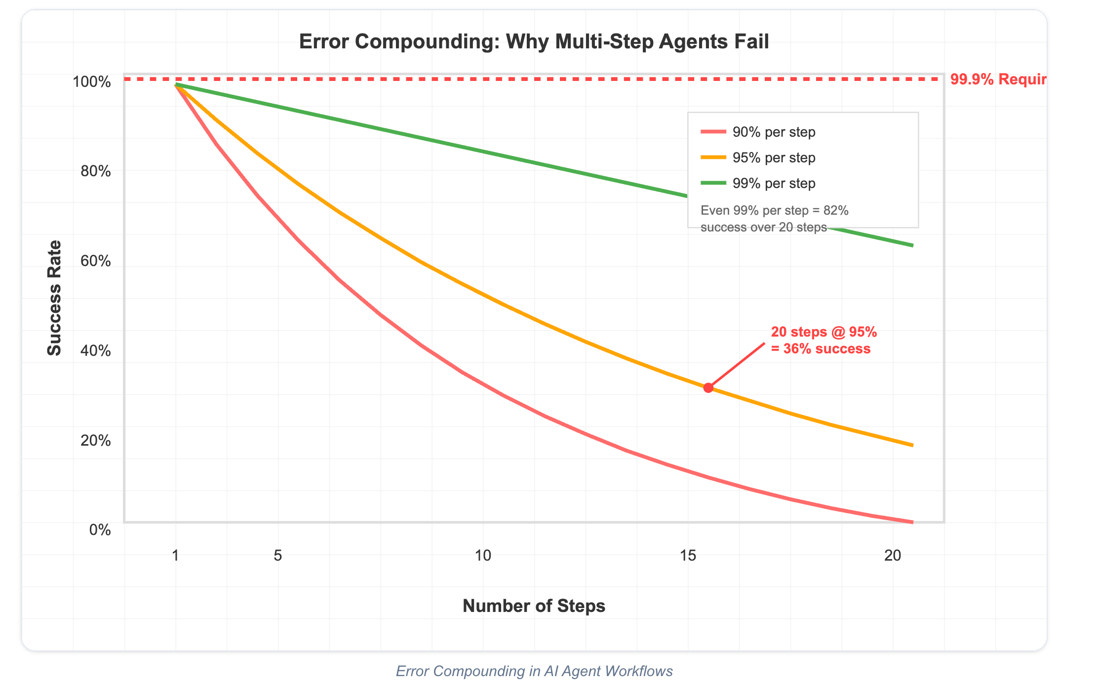 Error rates compound exponentially in multi-step workflows. 95% reliability per step = 36% success over 20 steps. Production needs 99.9%+.