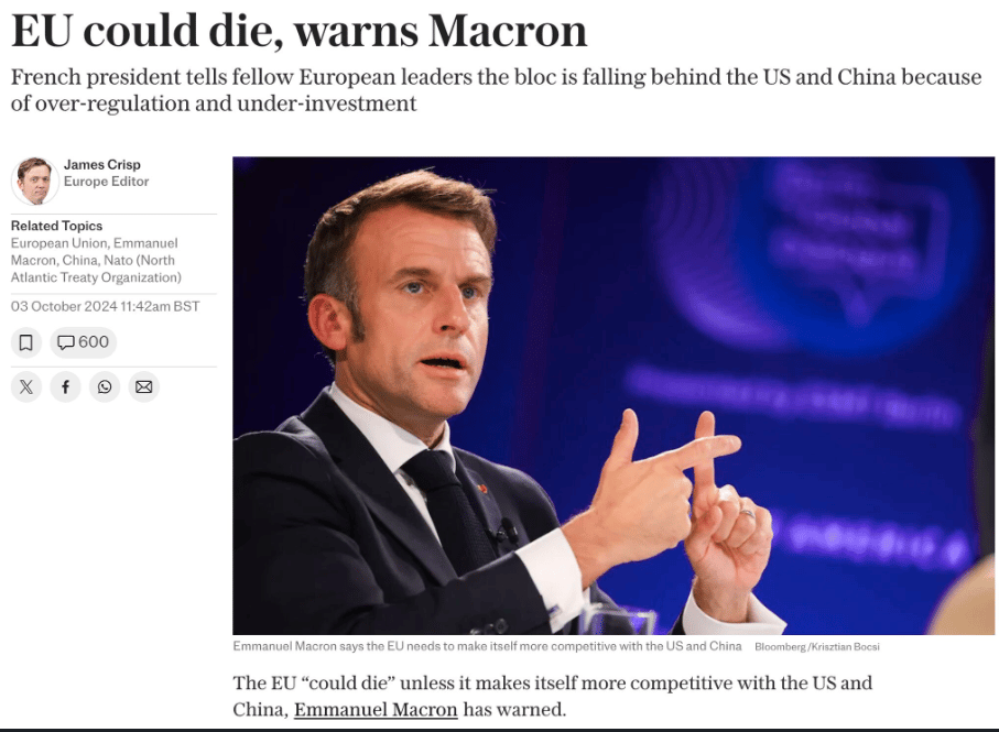 French President Macron warns that the EU could due to over-regulation and under-investment. He claimed the EU continues to fall behind the U.S. and China for these reasons and if things don’t change in 2-3 years, the EU would be “out of the market”.
