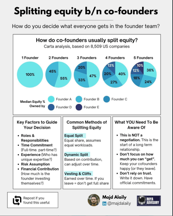Data from Carta, which was based on 8,509 US companies show potential common scenarios in companies with 1-5 co-founders, including median equity owned by each founder.