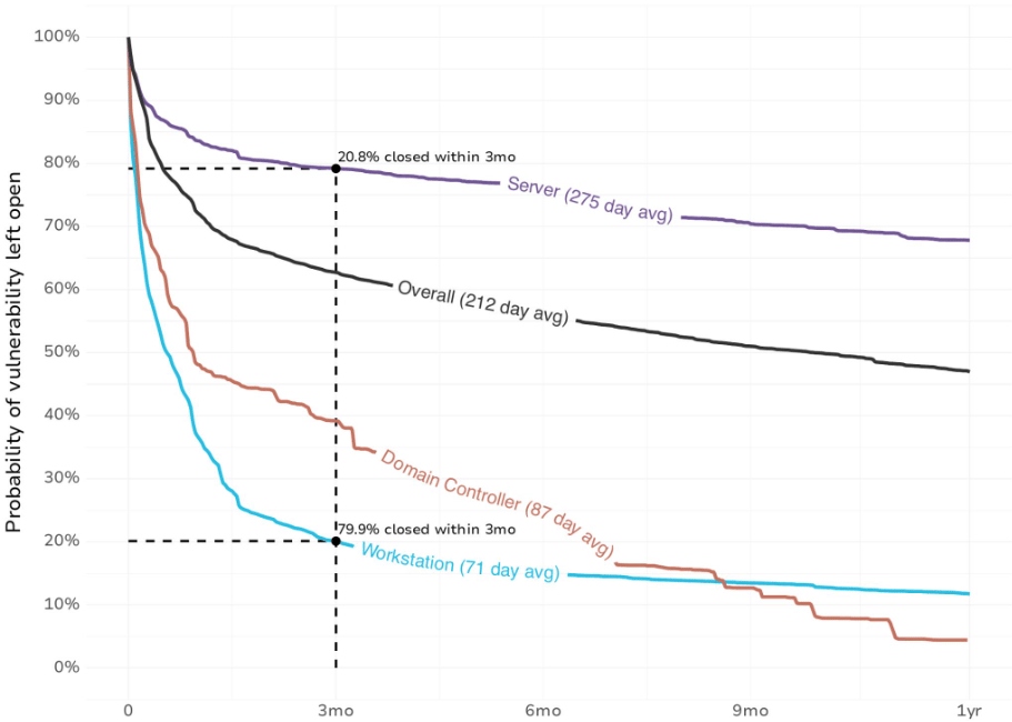 Wade Baker of Cyentia recently shared some insights from a study they collaborated with vendor NopSec on, which shows average timelines for vulnerability remediation. Overall the average is 212 days, though timelines vary across workstations, domain controllers and servers.