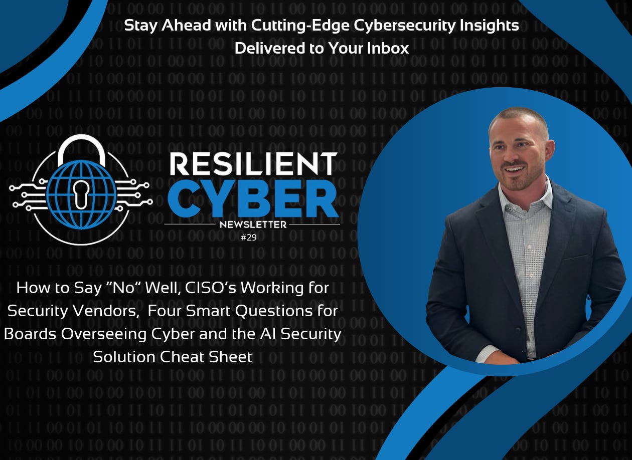 How to Say “No” Well, CISO’s Working for Security Vendors, Four Smart Questions for Boards Overseeing Cyber and the AI Security Solution Cheat Sheet