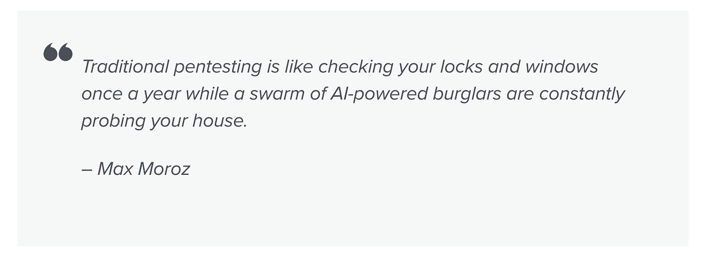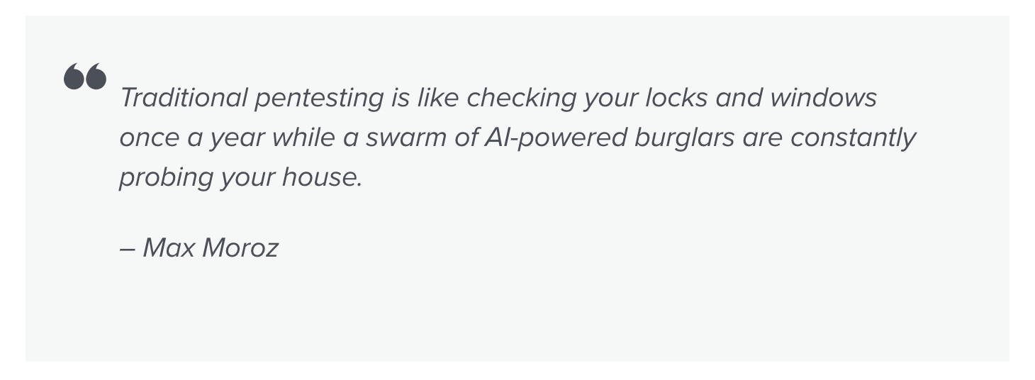 It discusses why traditional pentesting is no longer enough, due to factors such as mounting unpatched vulnerability backlogs, growing numbers of CVEs, and complexities in modern environments due to Cloud, DevOps, and SaaS. I particularly liked the below quote from Max Moroz as it summarizes not just pentesting but the current state of compliance in Cyber too, which is a snapshot-in-time model with cyclical reviews and assessments, when the threat is constantly changing as well as the underlying environments being assessed.