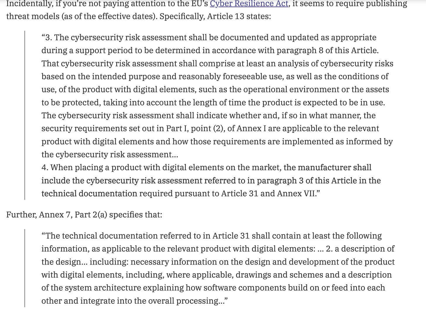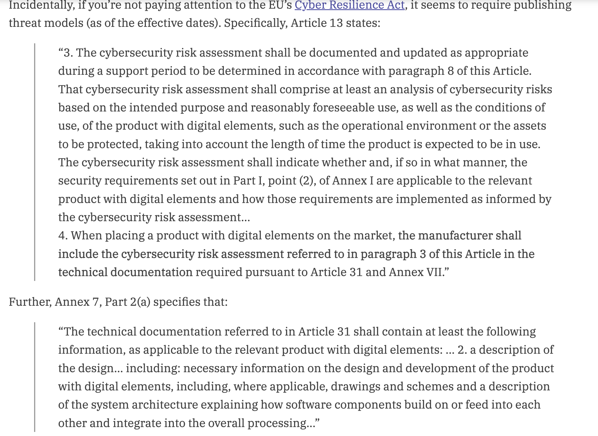 However, Adam Shostack of Threat Modeling fame makes the case that it is exactly what we should be doing. In addition to an essay arguing for the practice, Adam points to emerging compliance requirements, particularly from the compliance juggernaut, the EU, that may require it.