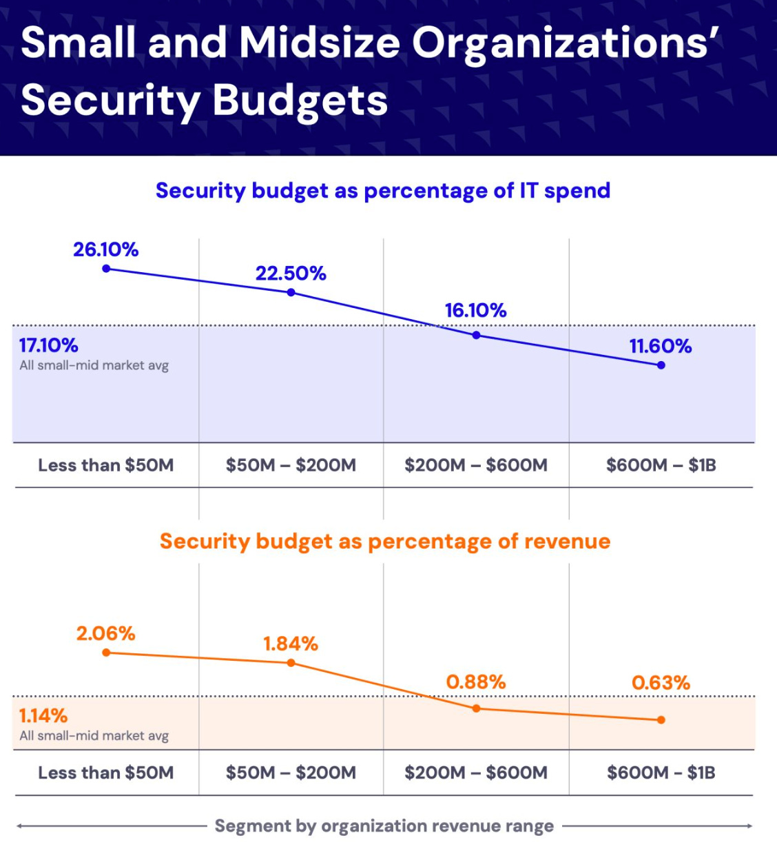 This makes sense given larger firms have both larger IT spending and revenue but I was personally surprised to see that security budgets are nearly 20% for SMB’s under $50m, which shows just how seriously many of them take security threats, at least from a resource allocation perspective.