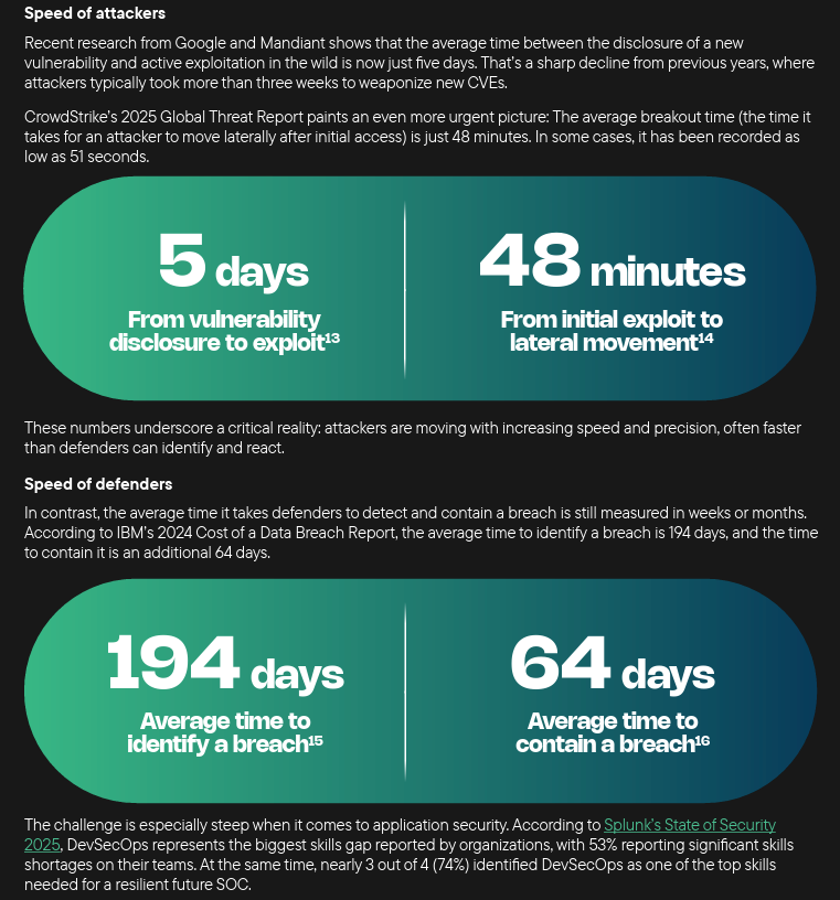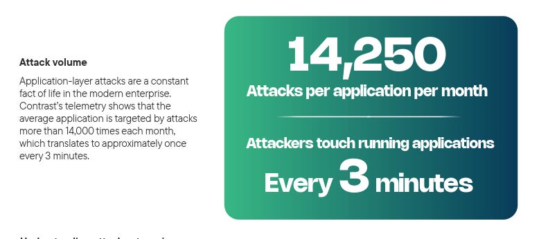 The report discusses how AI-driven development is only exacerbating existing AppSec challenges, and the average application is exposed to 81 confirmed viable attacks monthly, and over 10,000 probes/attack attempts that don’t succeed. This is all while the average number of vulnerabilities continues to grow per application.