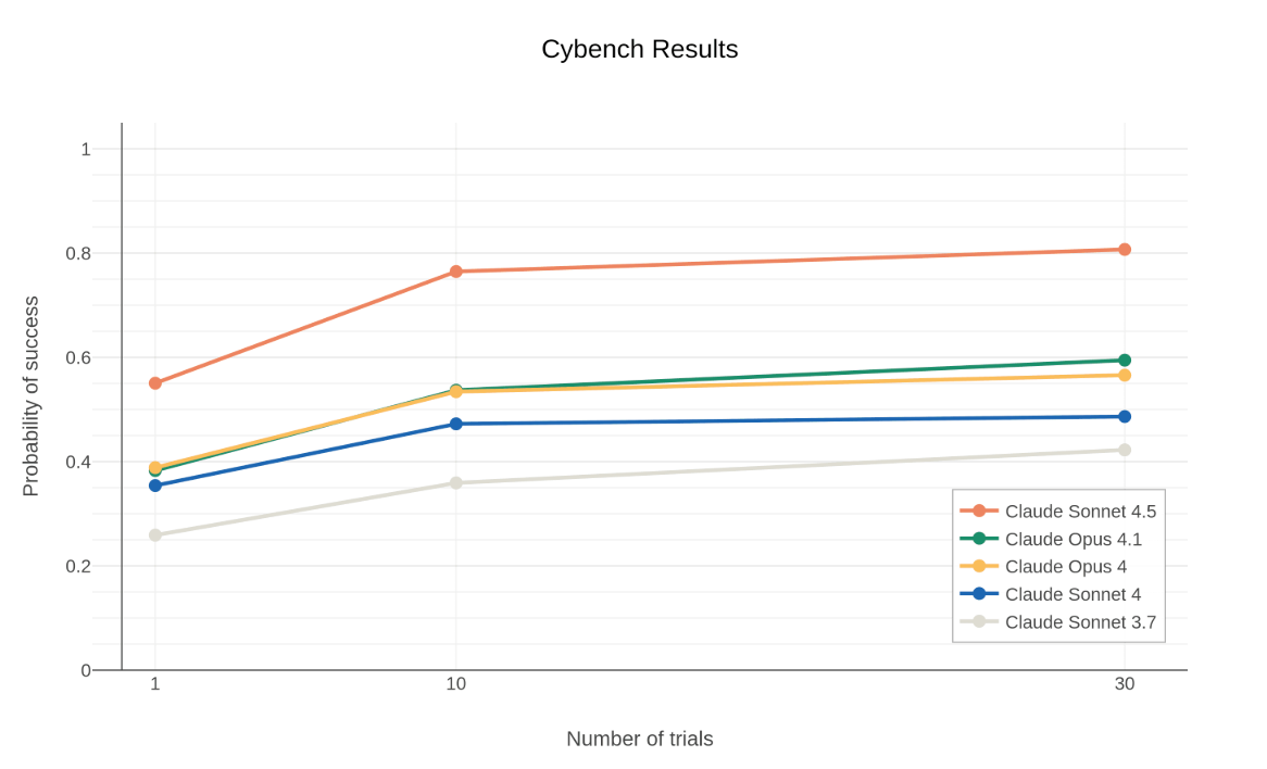 On Cybench, which focuses on cyber CTF challenges, Claude Sonnet 4.5 succeeded on 76.5% of challenges, especially when given 10 attempts, which is DOUBLE the success rate in just six months over Sonnet 3.7