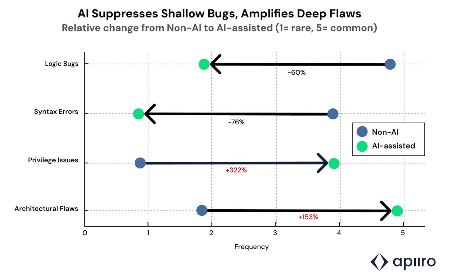 They found that while the AI coding tools were great at fixing logic flaws, symantic errors, typos and more, they didn’t do so great at catching or stopping vulnerabilities and security-focused flaws, with privileged escalation paths jumping 332% and architectural design flaws growing 153%.