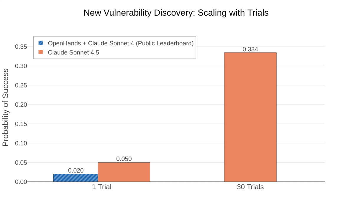 Sonnet 4.5 was also able to discover NEW vulnerabilities in 5% of cases in a single attempt, and when given 30 attempts, found NEW vulnerabilities in over 33% of projects.
