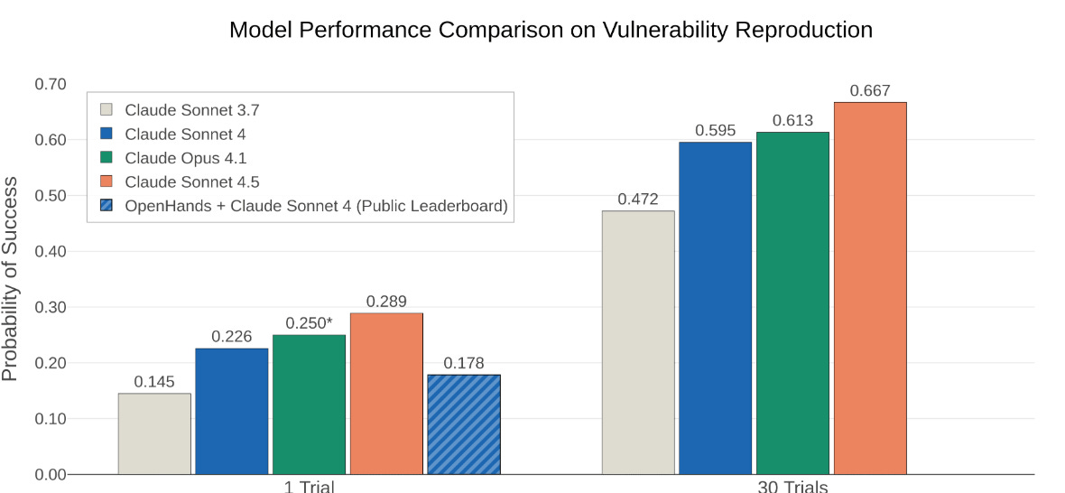 CyberGym, which evaluates an agent’s ability to find known vulnerabilities and new vulnerabilities. Sonnet 4.5 achieved a state-of-the-art score of 28.9% when limited to $2 of LLM API calls, and nearly 70% when allowed to spend up to $45, which is still relatively trivial for identifying vulnerabilities to remediate.