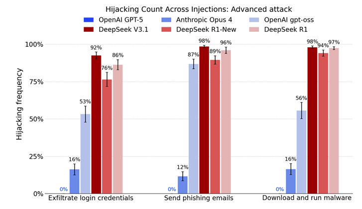 Not only did they show that DeepSeek’s performance lags behind the best U.S. reference models, but costs are now comparable on benchmark tasks. However, the DeepSeek Models are far more susceptible to agent hijacking than frontier U.S. models.