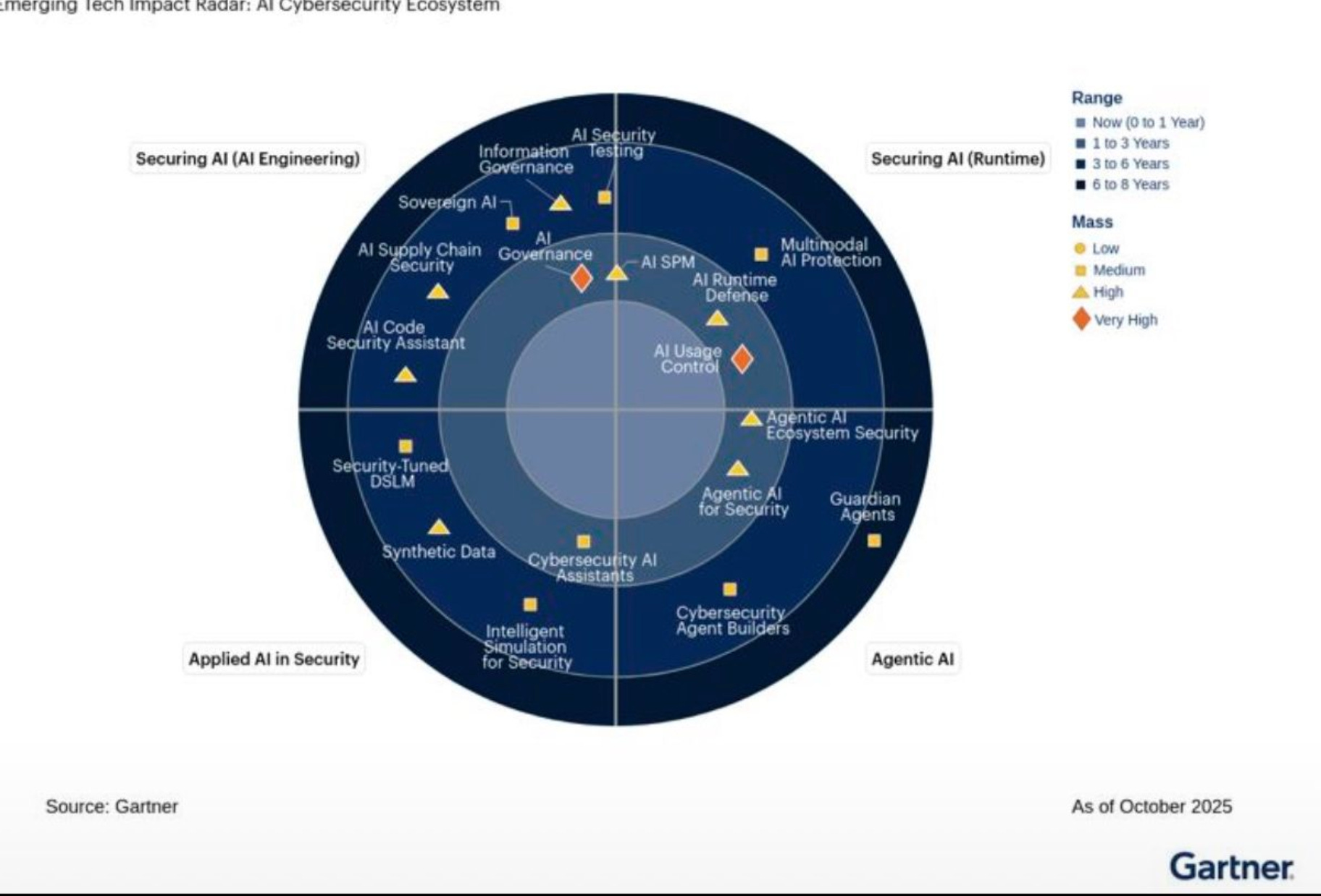 AI is a double edged sword as we know. Both needing to be secured and offering value for security. This is an interesting chart from Gartner showing the different niches as well as how far away they speculate them to be.