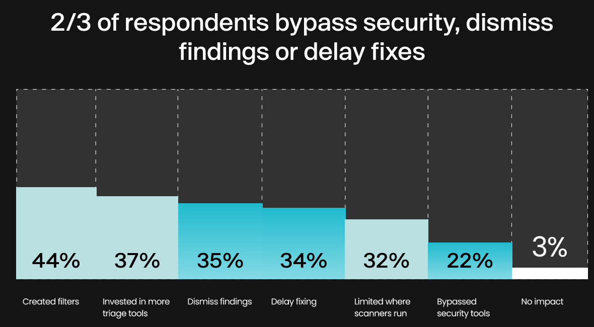 Despite of all the chants of “built in not bolted on!” security still is an afterthought or something that is dismissed, with 2/3 of the respondents stating they bypass security, or dismiss findings and fixes: