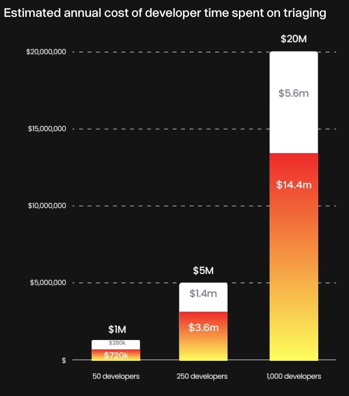 The developer tax from security continues, with 15% of engineering time being lost to chasing down scanning alerts, false positives and triage of findings, amounting to an insane $20 million per year for a 1,000 dev organization: