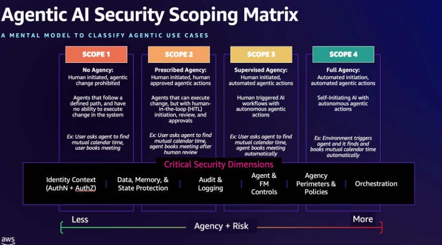 That’s why AWS’s new Agentic AI Security Scoping Matrix is a great resource for the community. It involves “four architectural scopes that represent the evolution of agentic AI systems based on two critical dimensions: level of human oversight compared with autonomy and the level of agency the AI system is permitted to act within.”