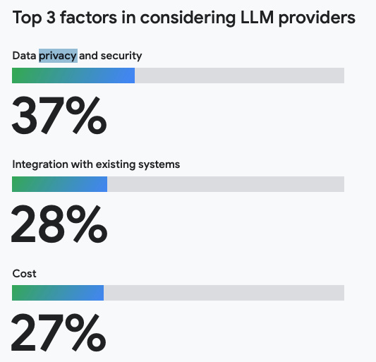 Additionally, Data Privacy and Security continues to be one of the leading blockers to adoption and also a key consideration when evaluating LLM providers for use. This is refreshing, validating the fact that organizations and consumers are thinking about the security implications of AI adoption, while also looking to keep pace and innovate.