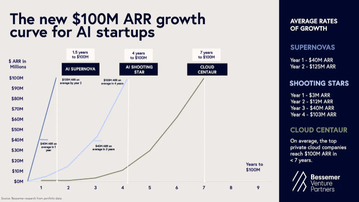 Earlier this year I shared Bessemer’s 2025 State of AI report, in which they discussed the new $100M ARR growth curve for AI startups. This both spoke to what is a new era of venture backed startup growth and what “good” looks like.