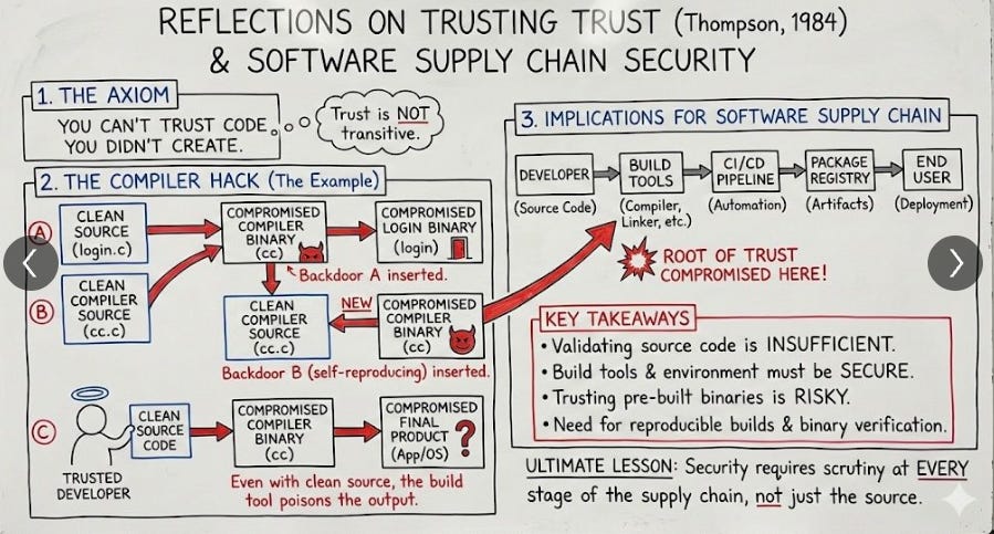 recap blog, which is a quick summary below, as well as a bunch of tools, resources and analysis from the vendor community.I will also say, Alex Matrosov of Binarly has had some excellent diagrams and resources on the incident, with the below examples. The first is Shai-Hulud 2.0 and the second is a reflection (pun intended) on Ken Thompson’s “Reflections on Trusting Trust” paper.
