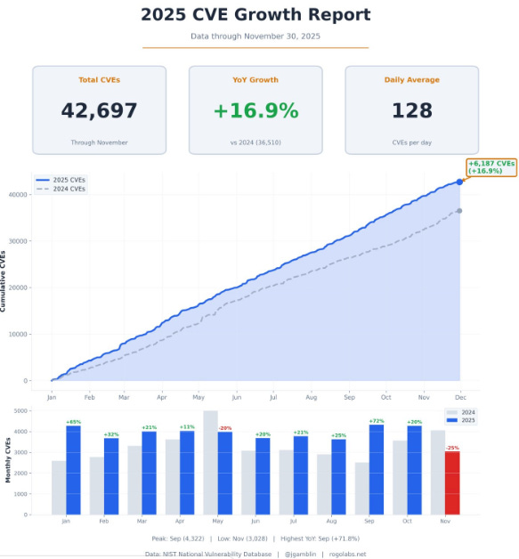 He recently shared a 2025 CVE Growth Report, through November 30th 2025, showing +16.9% YoY CVE growth, with a daily average of 128 and over 42,000 CVE’s this year thus far.