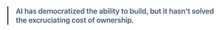 Caleb covers the Build vs. Buy paradigm with an AI twist in a really excellent way and this is a great read for those looking to understand what is and will continue to unfold in enterprises as folks are deluded into thinking they can just build something versus needing to buy it, while ignoring the long tail challenges and complexities that come along with doing so.