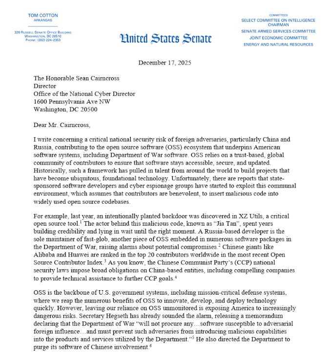 Malicious actors continue to pursue novel attack vectors, some technical, some social and often a mix thereof. The list of incidents is long and only expanding.Now, Senators and the Secretary of the DoW are raising alarms about the opaque and problematic challenges of open source consumption.