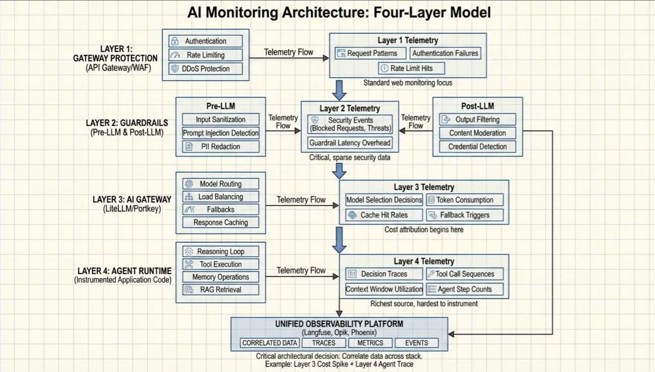 As we enter an era where organizations will see agents exponentially outnumber human users, it warrants a rethinking of how we approach observability. This is a good blog from Michael Hannecke. He discusses the agent monitoring gap, and how agents violate traditional assumptions such as non-determinism, autonomous resource consumption, and opaque decision chains. He proposes a four layer AI monitoring architecture, consisting of: