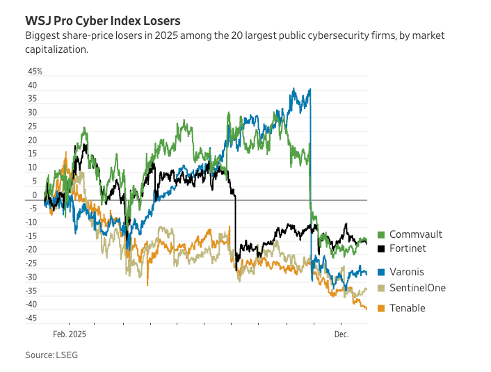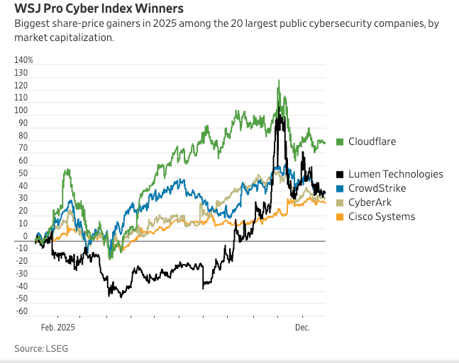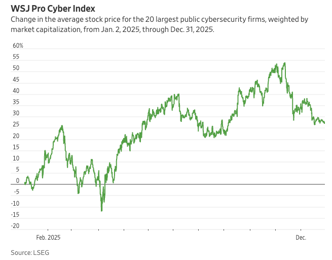 The WSJ reported that its “Cyber Index” which is the top 20 public cyber firms by market cap ended up increasing more than 27% in 2025, but that is also down from gains twice as big earlier in the year.