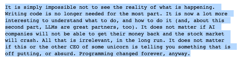 Salvatore Sanfilippo (antirez), creator of Redis, argues programmers shouldn’t dismiss AI’s transformative impact. In one week of prompting, he: modified his linenoise library for UTF-8 support, fixed transient Redis test failures, created a pure C BERT inference library in 5 minutes (700 lines), and reproduced weeks of Redis Streams work in 20 minutes.