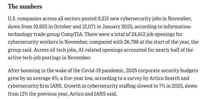 On the topic of jobs, AI and economics, WSJ recently also had a piece discussing flat budgets and shaky economics are keeping cyber hiring in a holding pattern as teams look to invest in automation for security tools.