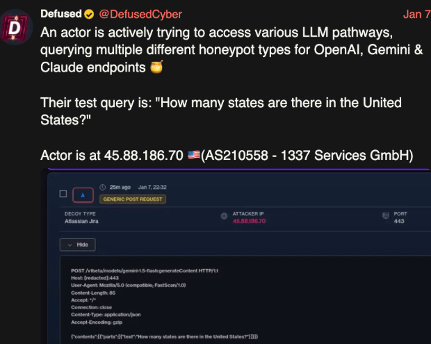 This included doing recon such as scanning for API endpoints of the leading model providers, building out a target list and using infrastructure GreyNoise is able to attribute to prior malicious exploitation attempts such as React2Shell and hundreds of other vulnerabilities. This is a great blog from Bob and the GreyNoise team that not only documents the observations but also provides practical tips to defend your LLM infrastructure as well.